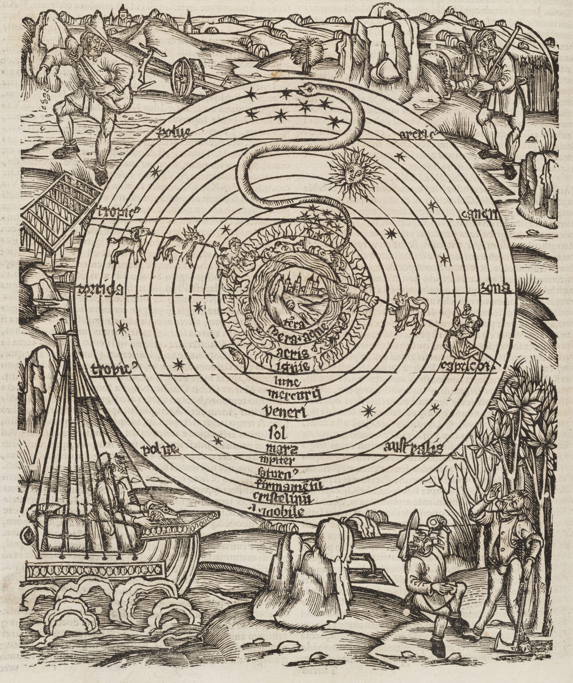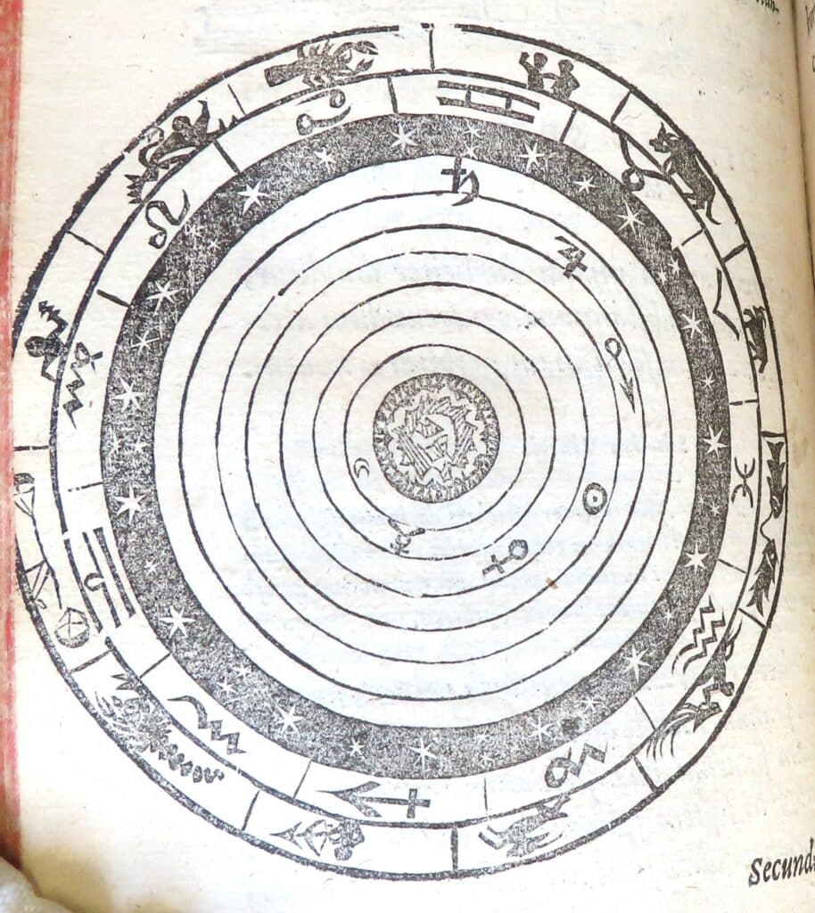 Aristotle’s Physics divided the universe into two realms. In the sublunar world (literally ‘below the moon’), the four basic elements of Earth, Water, Air and Fire are subject to constant growth, change and decomposition, whereas above the moon in the superlunar world, the five known planets and innumerable fixed stars followed their courses with perfect regularity. In Aristotle’s physics, solid earth as the heaviest element lay at the centre of a geocentric universe within concentric spheres of water, air, fire, themselves surrounded by the orbits of the celestial bodies fixed in constantly rotating spheres of a perfect unchanging fifth element called ‘aether’.