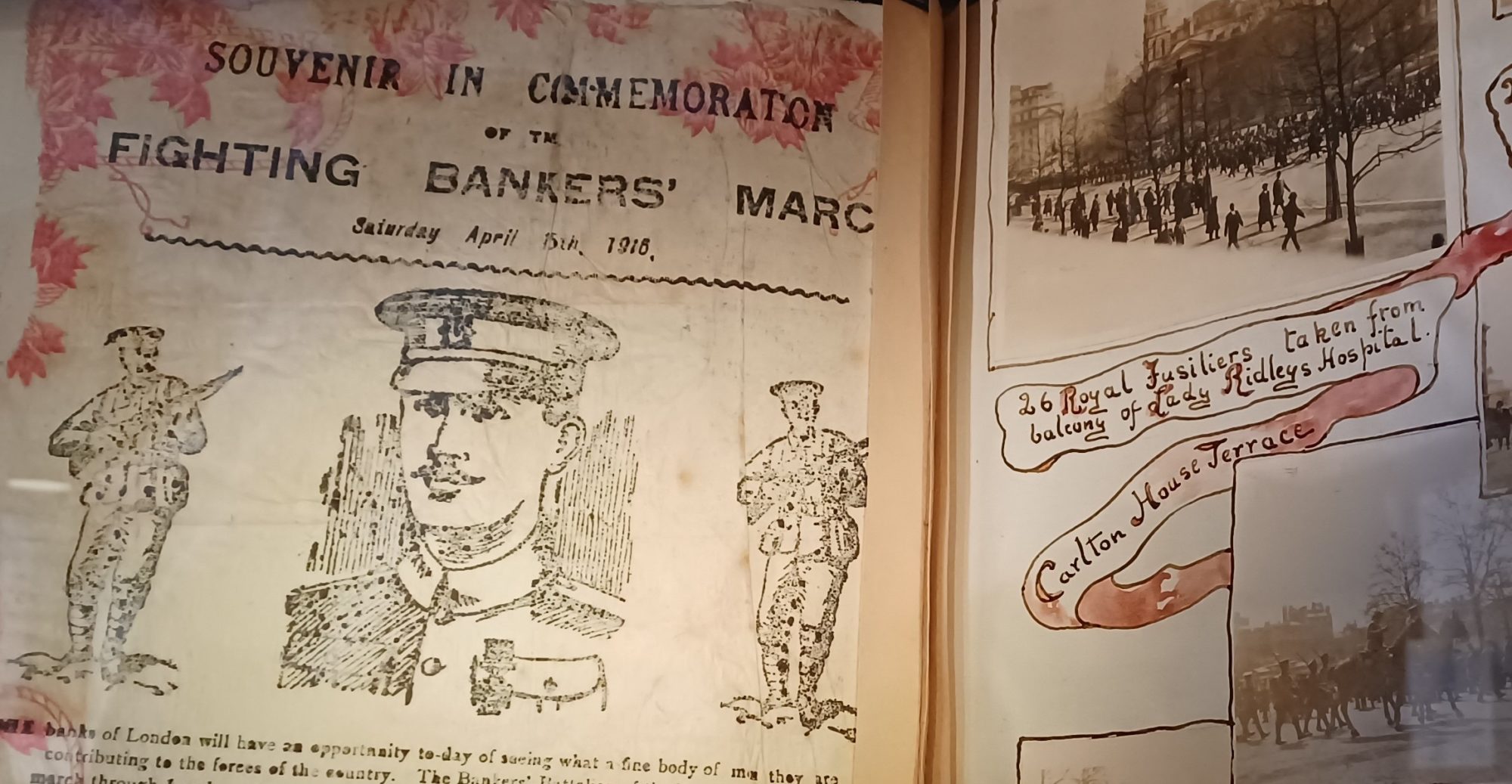 Valerie North, whose husband and son both saw action during the First World War, kept a series of scrapbook diaries carefully illustrated with photographs, ephemera and her own drawings and watercolours. Recording the war from the perspective of the Home Front, the scrapbooks capture the war effort as Anne Thackeray Ritchie would also have witnessed it. These pages depict a military march in London in December 1916.