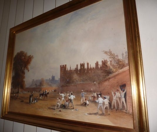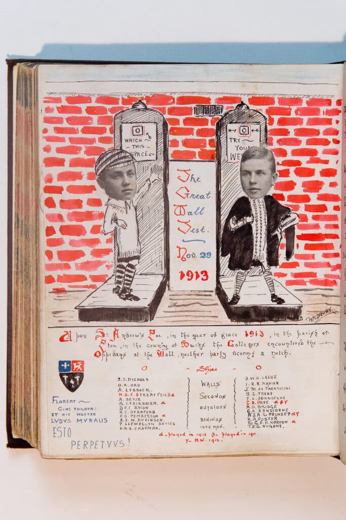 Along with Oxford v. Cambridge at the Field and the Lower Boy House Cup, one of the key fixtures of St Andrew’s Day is the annual Wall Game match between Collegers (King’s Scholars) and Oppidans (the rest of the school). The game is a form of football, played along a length of wall that runs along Slough Road.