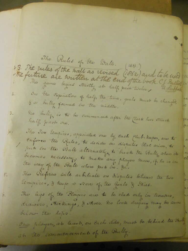 A Collegers v. Oppidans match at the wall is alluded to in 1820, but full records only date from 1841 (the year that the first rules appear). In 1827 the match was banned due to a fight, but was revived again in the mid-1830s.