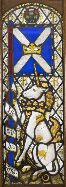 The St Andrew’s Cross (or flag of Scotland) flies over Upper School during each St Andrew’s Day celebration at Eton. Sadly, this year there can be no visitors to the college for the event, but the flag is represented by this stained-glass panel, which depicts a heraldic unicorn bearing a banner with the flag of St Andrew. [1]