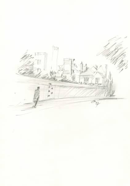 John Melvin’s drawing records the brick wall that separates the Slough Road and College Field, to the north of Eton College. Some college buildings can be seen in the distance.[3]