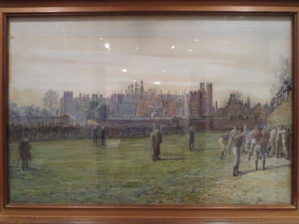 Thomas Hemy’s watercolour, showing the Eton Wall Game in progress, was painted in 1887. The players are seen huddled in a ‘bully’ against the wall, whilst a crowd of onlookers, both those on the ground and boys sat atop the wall, enjoy the spectacle.[4]