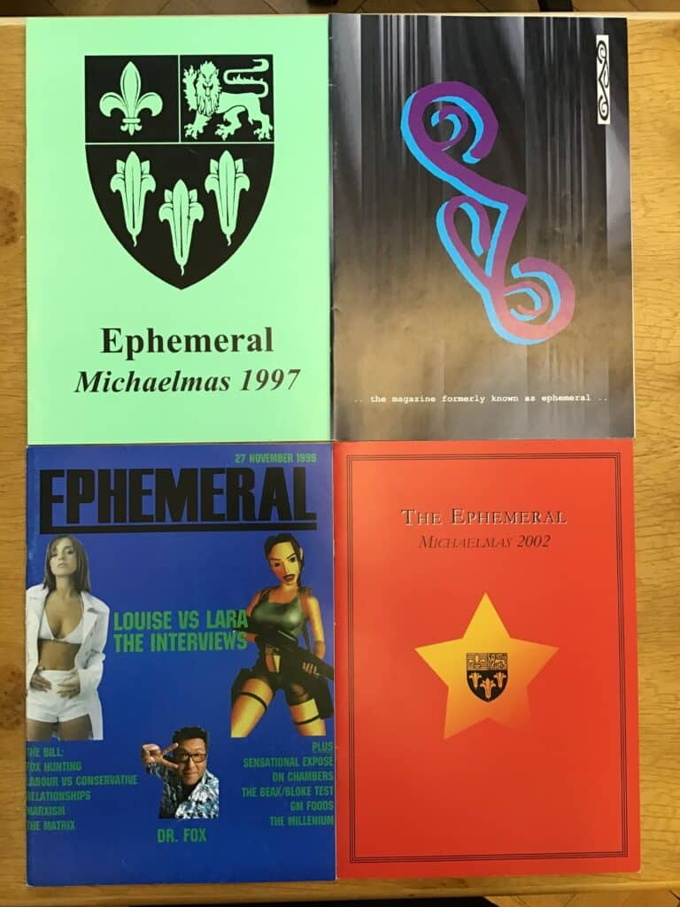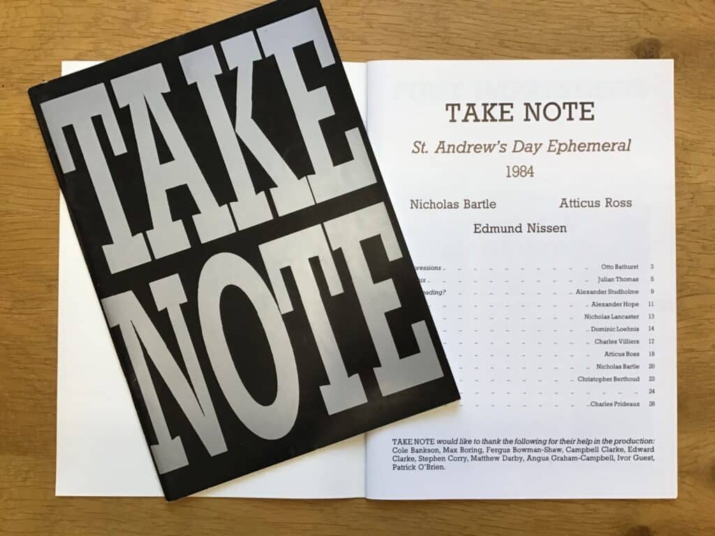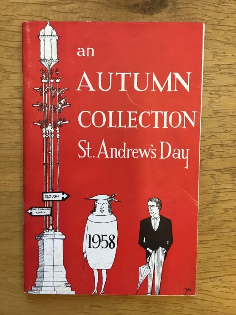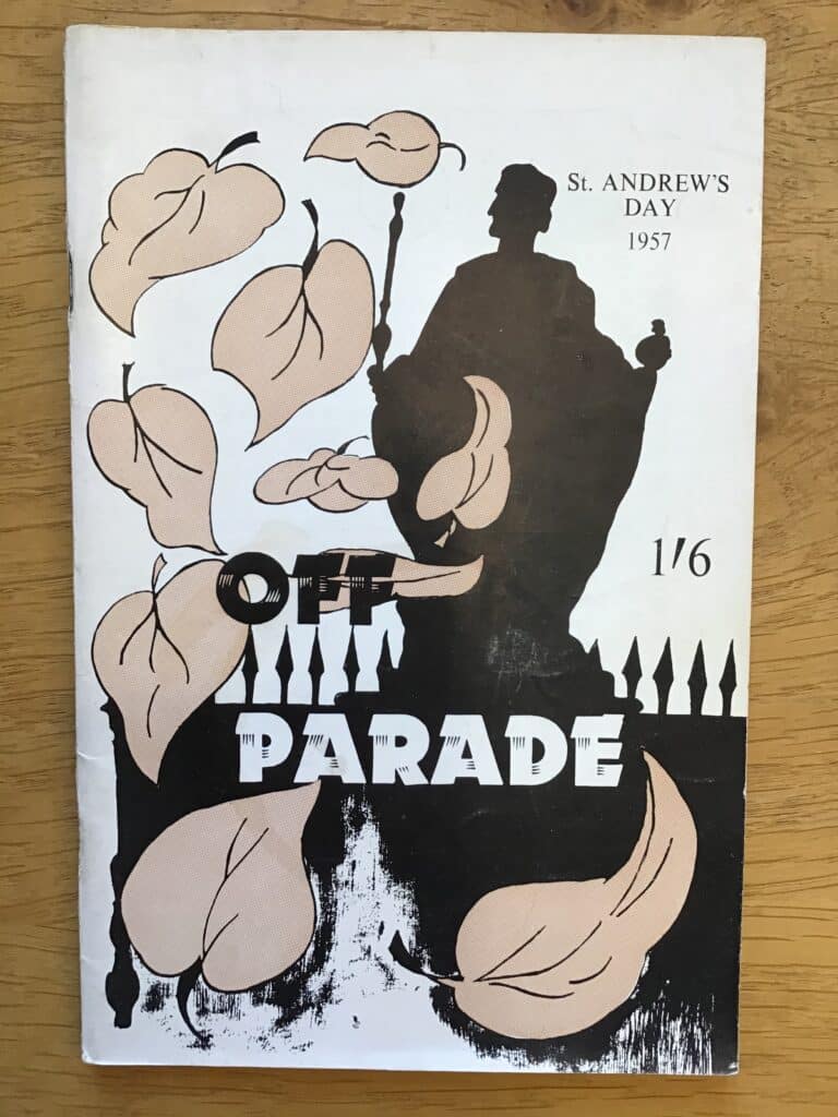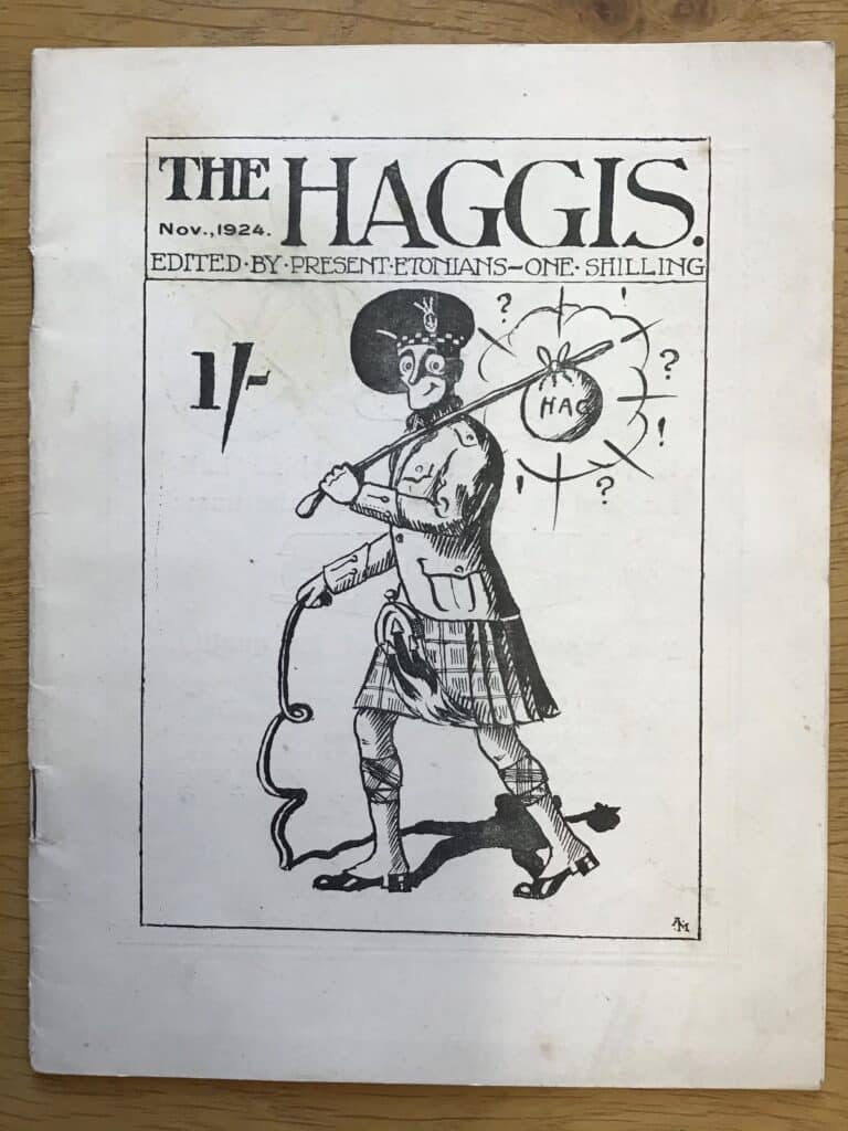 Etonians have been producing periodicals since the late 18th century when The Microcosm was issued by a group of friends at the school in 1786-87. Many of these publications, written and edited by boys, were irregular or short-lived, hence the umbrella term “ephemerals”. Such magazines produced by academic departments or boys’ societies are still a familiar feature of Andrew’s Day and the Fourth of June. This year their distribution will take place mostly online, and this slideshow presents a selection of designs from a century of St Andrew’s Day ephemerals.[2]