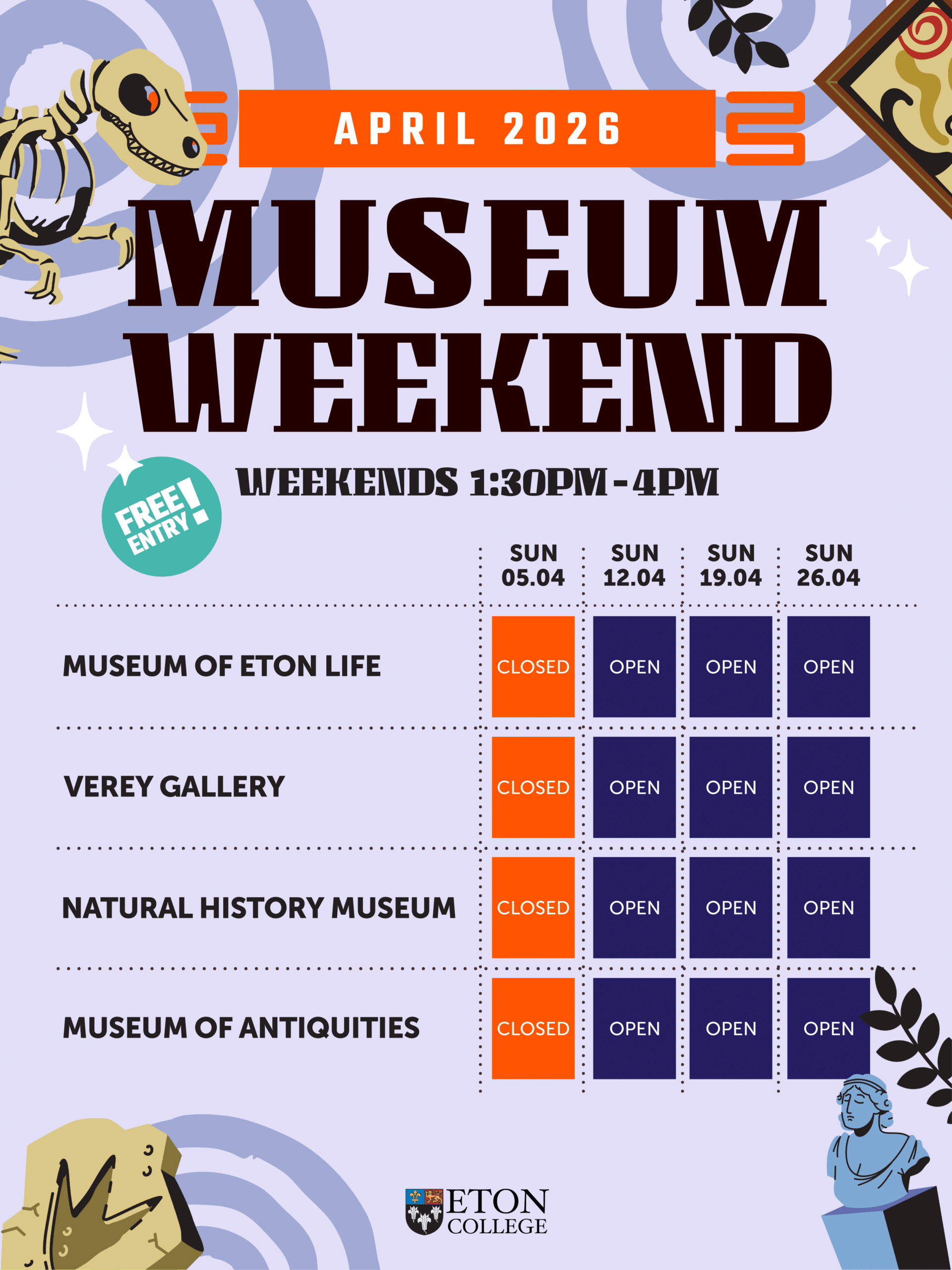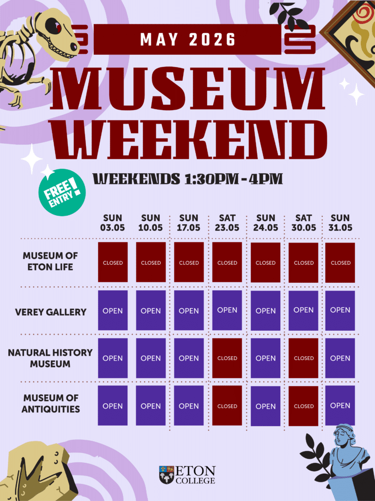All are welcome at our regular openings of our museums and galleries on weekend afternoons. Staff are on hand in the Museum of Antiquities, the Museum of Eton Life, the Natural History Museum and the Verey Gallery to welcome you and answer any questions during public opening hours. Please see What’s On for more information and dates of special exhibitions. The museums and galleries may occasionally close due to holidays or exceptional circumstances.
